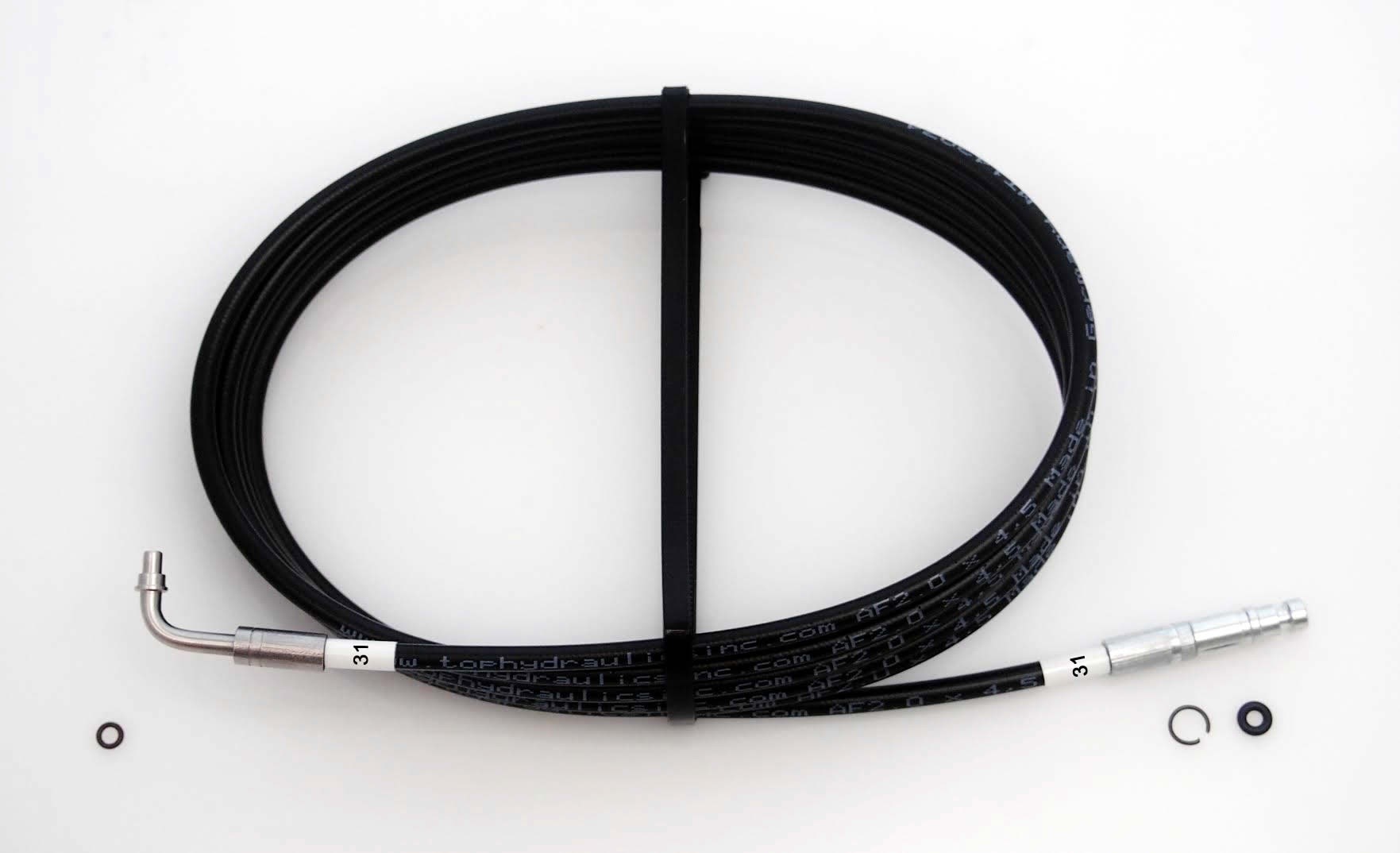New, upgraded Hydraulic Line #31 manufactured by Top Hydraulics, Inc. for 2009-2020 Nissan 370Z Convertible. This line runs from the shaft end of the Left Tonneau Cylinder to the Hydraulic Pump.