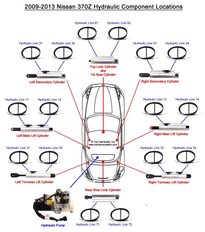 All seven convertible top hydraulic cylinders, hydraulic hoses, and the hydraulic pump for your 370Z are sold by Nissan only as a complete set, part number 97093K. No need to buy a complete hydraulic system, when you can have your components upgraded by Top Hydraulics for far less money!